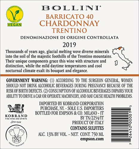Barricato 40 Chardonnay Trentino DOC 2019 Back Label (vegan)
