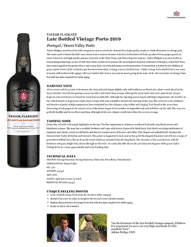 Taylor Fladgate Late Bottled Vintage Porto Sell Sheet – James Suckling, 93 Points